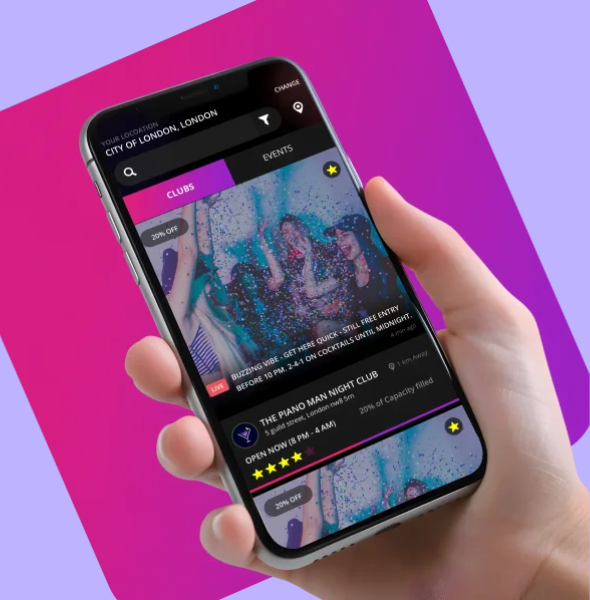 The app helps clubs and venues communicate live offers, crowd updates, and other perks - motivating users to decide quickly and boosting engagement for both users and venues.
